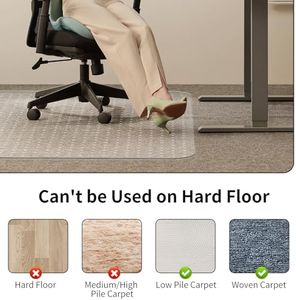 Size and ShapeThe size and shape of the chair mat should match your workspace and the area you need to cover. Chair mats come in various shapes, such as rectangular, square, and lip-shaped, which extends under the desk. Measure the area where you will use the mat to ensure it fits well and provides enough coverage for your chair's movement. If you have a large desk or workspace, opt for a larger mat to allow for more freedom of movement. For smaller spaces, a compact mat may be more appropriate.